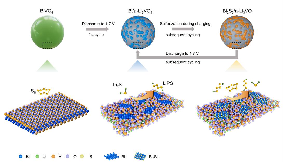 本研究中,作者基于催化劑結(jié)構(gòu)重組這一催化反應(yīng)中的特殊現(xiàn)象,創(chuàng)新性地提出在硫正極中引入具有合適氧化還原電位的轉(zhuǎn)化型電極材料作為載體,通過電化學(xué)驅(qū)動(dòng)的結(jié)構(gòu)重構(gòu)進(jìn)一步產(chǎn)生高活性的催化位點(diǎn),并基于BiVO4的電化學(xué)轉(zhuǎn)化反應(yīng)原位構(gòu)建了Bi/非晶Li3VO4(a-Li3VO4)和Bi2S3/a-Li3VO4異質(zhì)結(jié)的可逆催化循環(huán)體系。該催化體系獨(dú)特的異質(zhì)結(jié)構(gòu)和電化學(xué)驅(qū)動(dòng)的尺寸限制能夠?yàn)橐种拼┧笮?yīng)和促進(jìn)硫轉(zhuǎn)化提供了豐富的位點(diǎn),同時(shí)p區(qū)Bi和Bi2S3與硫物種之間有效的p-p軌道雜化能夠顯著降低Li2S和多硫化鋰的轉(zhuǎn)化能壘,實(shí)現(xiàn)硫正極的高效可逆電化學(xué)轉(zhuǎn)化。相應(yīng)硫正極在10.3 mg cm?2的高硫負(fù)載量下循環(huán)120次后仍保有7.5 mAh cm?2的高可逆容量,且能夠在3 C大倍率下穩(wěn)定循環(huán)500周,對(duì)應(yīng)的容量衰減率僅為0.06%/周。