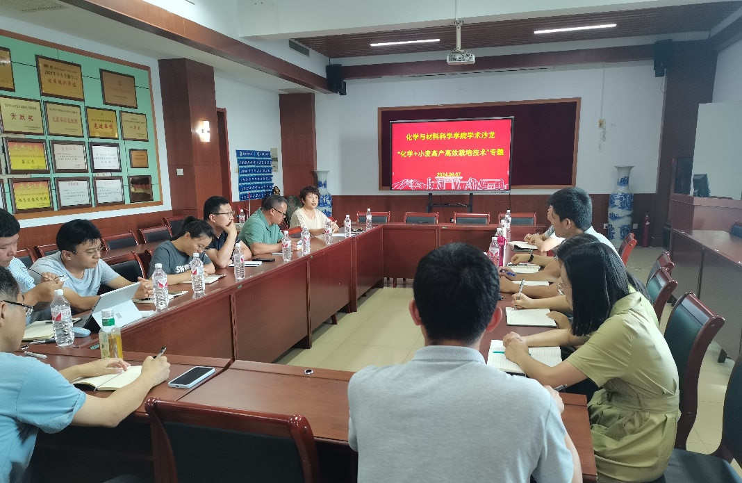 為進(jìn)一步提升學(xué)科交叉融合和創(chuàng)新能力,推動(dòng)化學(xué)學(xué)科與農(nóng)業(yè)的深度交叉融合,助力學(xué)校“雙一流”建設(shè)和高質(zhì)量發(fā)展,9月7日下午, “化學(xué)+小麥高產(chǎn)高效栽培技術(shù)“學(xué)術(shù)沙龍活動(dòng)在文理大樓811會(huì)議室舉行。化學(xué)學(xué)院院長(zhǎng)徐靜教授,農(nóng)學(xué)院副院長(zhǎng)李勇教授、駱永麗副教授、化學(xué)學(xué)院部分教師代表以及小麥栽培創(chuàng)新團(tuán)隊(duì)師生參加了此次活動(dòng)。學(xué)術(shù)沙龍由徐靜主持。