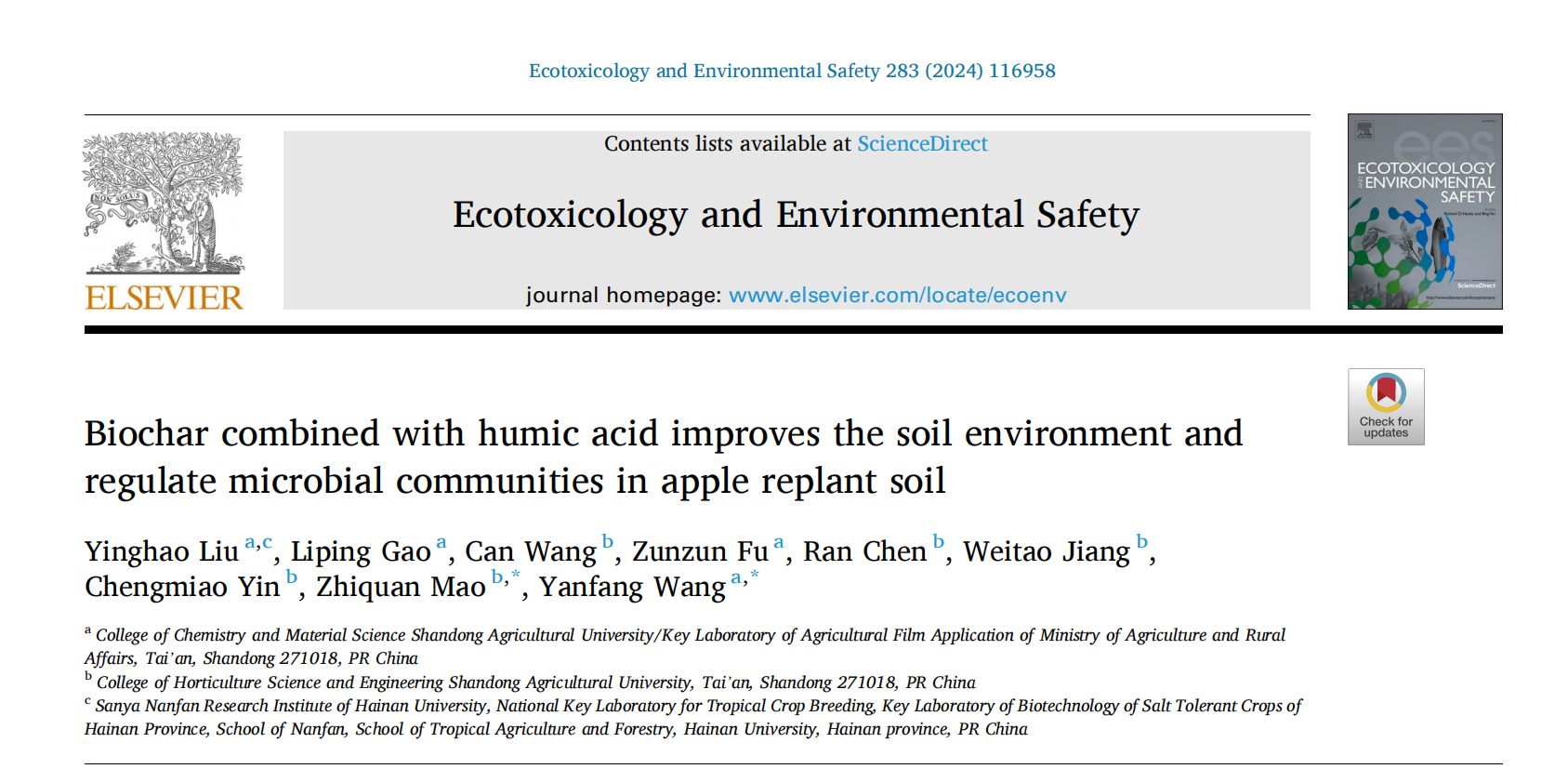 近日,王艷芳副教授課題組在環(huán)境科學(xué)領(lǐng)域TOP期刊 Ecotoxicology and Environmental Safety (IF:6.2)發(fā)表了題為Biochar combined with humic acid improves the soil environment and regulate microbial communities in apple replant soil的研究論文,已讀博研究生劉英浩為本文第一作者,王艷芳副教授、毛志泉教授為文章共同通訊作者,我校為第一單位。