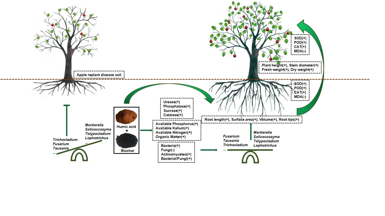 生物炭配施腐殖酸緩解蘋果連作障礙示意圖
