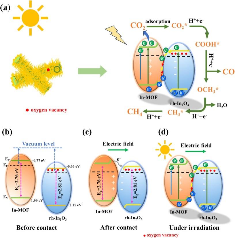 金屬-有機框架(MOF)材料由于具有孔徑可調(diào)、表面可裁剪、比表面積大等優(yōu)點被廣泛應(yīng)用于光催化還原CO2領(lǐng)域。然而,MOF材料在光催化中存在光吸收范圍窄和光生載流子易復(fù)合等問題,大大限制了其光催化還原CO2的活性。以MOF材料為模板構(gòu)筑S型異質(zhì)結(jié),提高MOF的光吸收范圍和電子-空穴分離效率,是將MOF應(yīng)用于光催化還原CO2的研究熱點。在該工作中,研究團隊創(chuàng)新性地采用原位部分煅燒方法,將In-MOF轉(zhuǎn)化為富含氧空位的In2O3@In-MOF S型異質(zhì)結(jié),擴大了In-MOF的光吸收范圍,提高了In-MOF的光生電荷分離效率,并且保留了In-MOF和In2O3的高氧化還原能力,從而提升了In-MOF的光催化還原CO2活性。這項工作為設(shè)計MOF基S型異質(zhì)結(jié)高效光催化還原CO2提供了一種新策略。