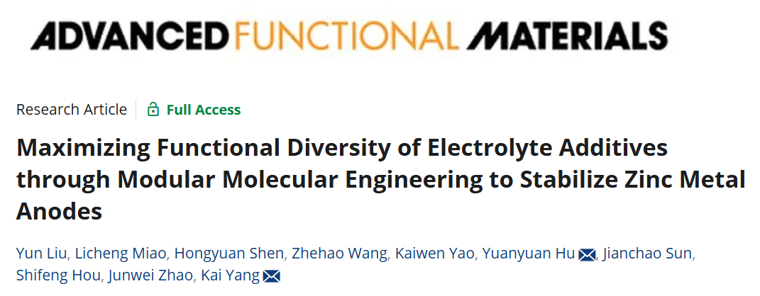 近日,省高校創(chuàng)新團隊帶頭人楊凱教授團隊在材料權(quán)威期刊《Advanced Functional Materials》(中科院一區(qū),自然指數(shù)期刊,影響因子18.5),發(fā)表題為“Maximizing Functional Diversity of Electrolyte Additives through Modular Molecular Engineering to Stabilize Zinc Metal Anodes”的最新研究成果。2022級碩士研究生劉云為論文第一作者,苗立成博士為共同第一作者,胡媛媛副教授和楊凱教授為論文通訊作者,山東農(nóng)業(yè)大學為唯一通訊單位。