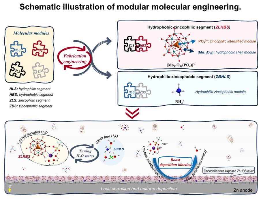近期,該團隊結(jié)合實驗和理論計算深入剖析POMs分子結(jié)構(gòu)的親/疏水和親/疏鋅特征,提出了一種電解液添加劑分子的模塊化設(shè)計策略,以實現(xiàn)添加劑優(yōu)化鋅負極穩(wěn)定性和可逆性的功效最大化。作為概念驗證,使用候選模塊化添加劑(NH4)3[PMo12O40]組裝的水系鋅離子電池在常溫和低溫下都表現(xiàn)出優(yōu)異的容量保持率和長循環(huán)穩(wěn)定性。這項工作為電解液添加劑設(shè)計開發(fā)提供了新的研究思路,推動了POMs結(jié)構(gòu)創(chuàng)新研究和水系儲能技術(shù)的實際應用進程。